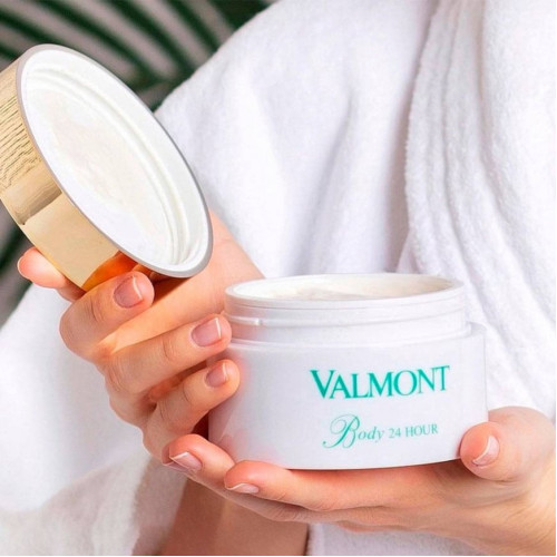 Опис аантивікового крему для тіла Valmont Body 24 Hour. Насичений та свіжий, Крем для тіла Body 24 Hour миттєво вбирається, забезпечуючи інтенсивне зволоження протягом усього дня. Усуває дискомфорт і сухість, шкіра стає м'якою та бархатистою. Анти вікові компоненти живлять шкіру, ділячи її еластичною та гладкою.